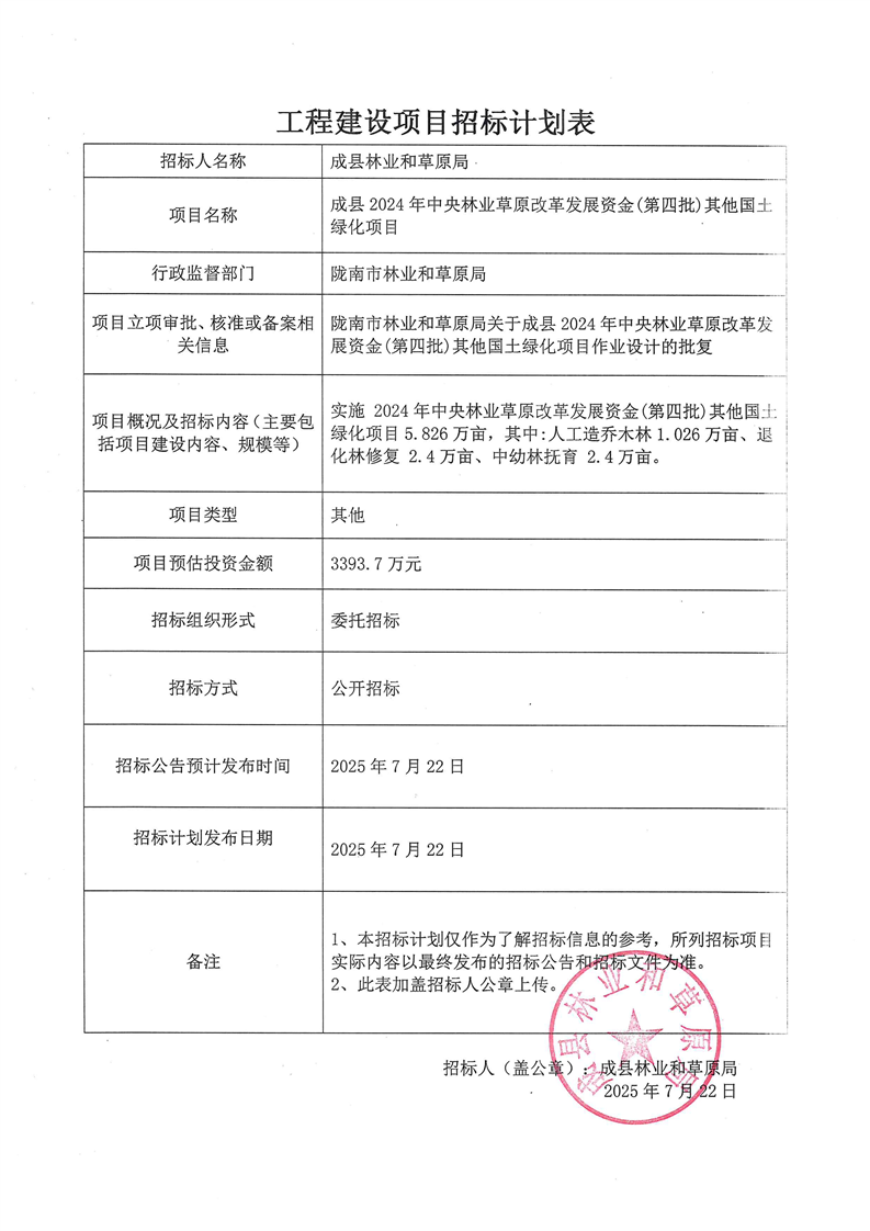 成縣2024年中央林業(yè)草原改革發(fā)展資金(第四批)其他國(guó)土綠化項(xiàng)目